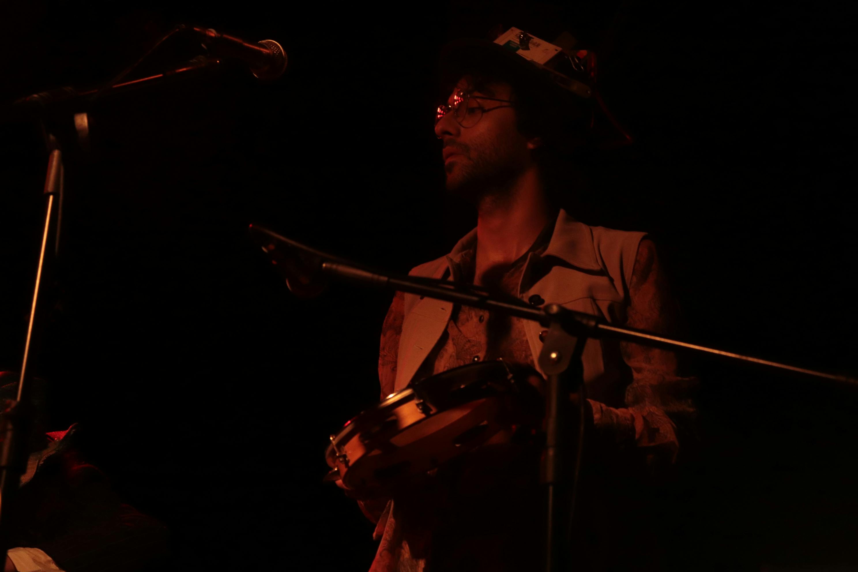 Marco alternava entre instrumentos de percussão variados enquanto não tocava seu clarinete. Foto por: Matheus Cerullo.