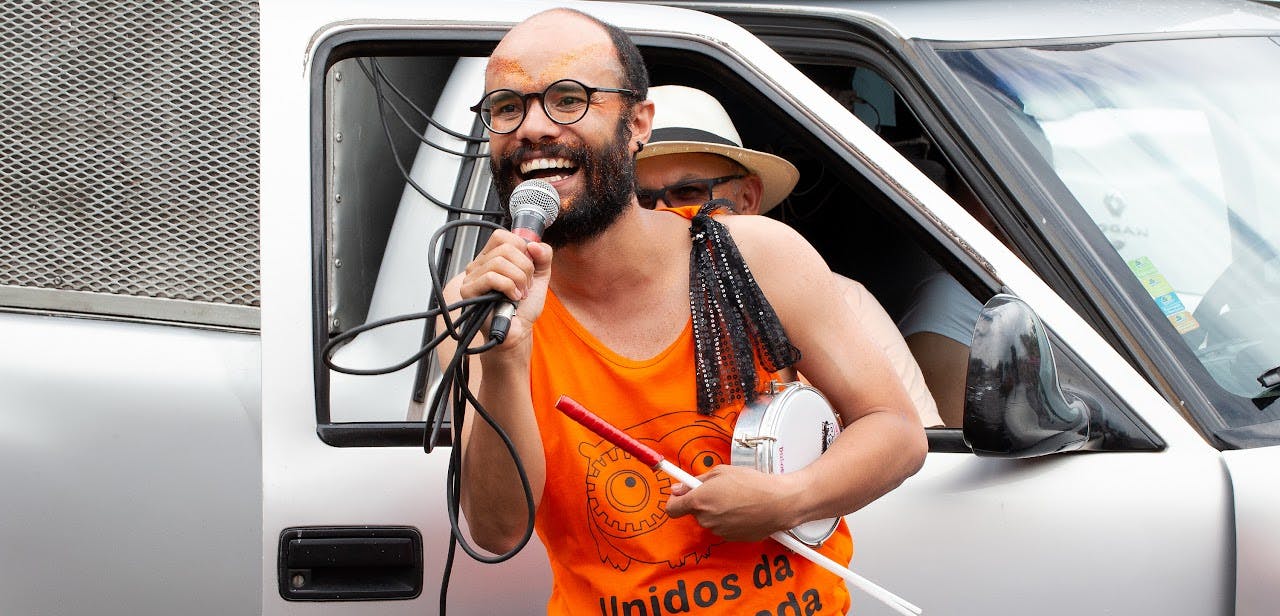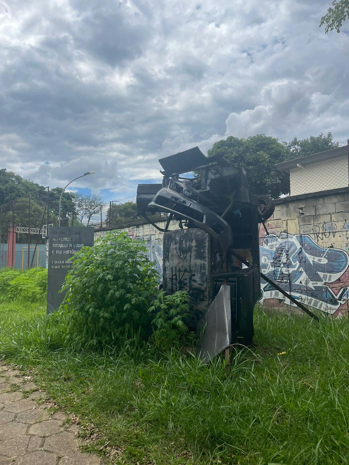 Logo que chegamos à Ocupação CDC Vento Leste, fomos guiados por um caminho que nos levaria à “arena arbórea” — um palco delimitado por árvores plantadas e uma arquibancada improvisada com pneus em um morro. Enquanto seguíamos Luciano, passamos por diversas instalações artísticas como placas de metal, contendo poesia de um festival passado e um enorme catavento de metal. Também passamos em frente aos galpões que hoje abrigam espaços de socialização, oficinas e o depósito do Bloco Unidos da Madrugada. Já na arena, Luciano nos contou a história da ocupação e nos falou sobre as aventuras artísticas protagonizadas pelo Coletivo.