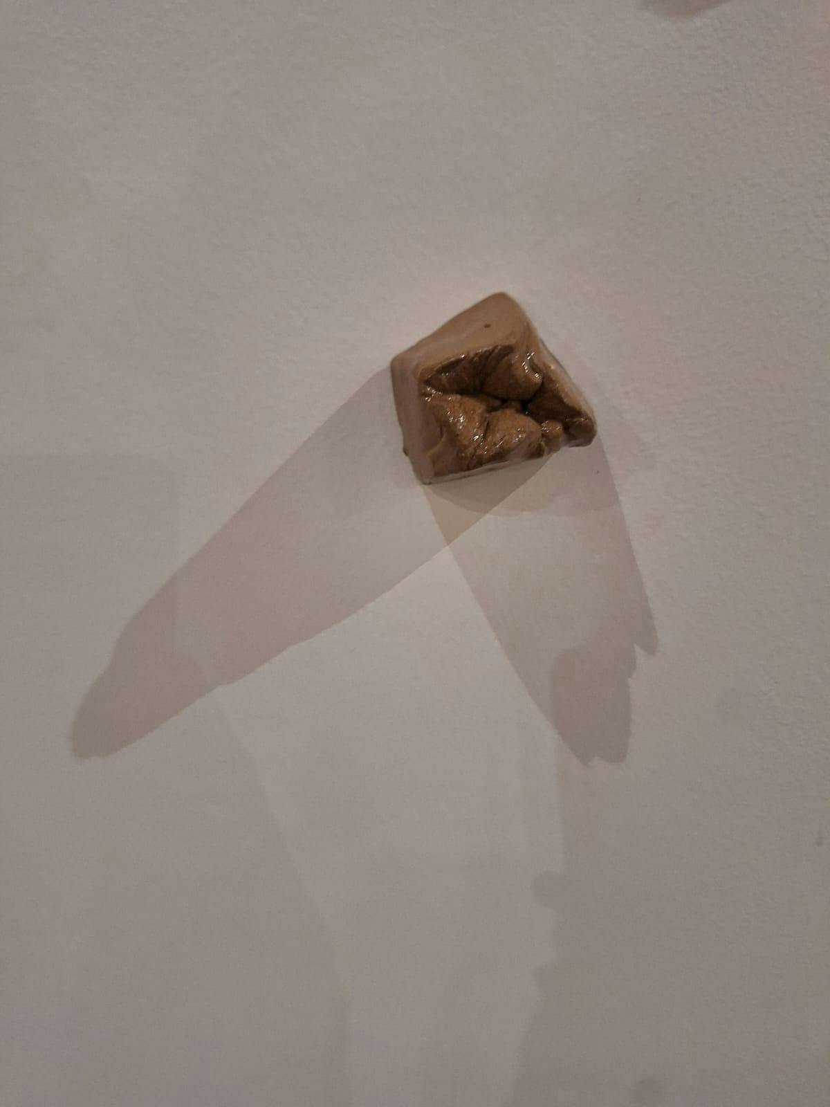 Clara escuta a fala da parceira. Além de uma performance junto de Nikke, a estudante expôs uma obra própria: “No alto do cume” (2025). Coletânea de oitenta e seis peças de cerâmicas, fixadas transversalmente na parede, recobrindo um espaço de quase quatro metros. Com pigmentos amarronzados, as cerâmicas são pequenas protuberâncias tortas, cuja ponta é abruptamente cortada em uma invaginação semelhante a um ânus.