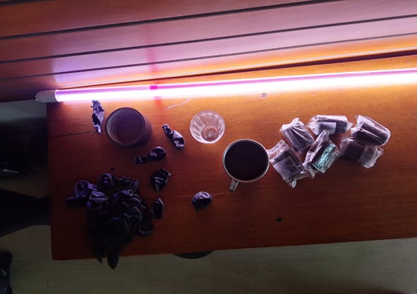Em um banco de madeiro, balões de festa, fitilhos e copos de bebida. Foto: Natalia Clima