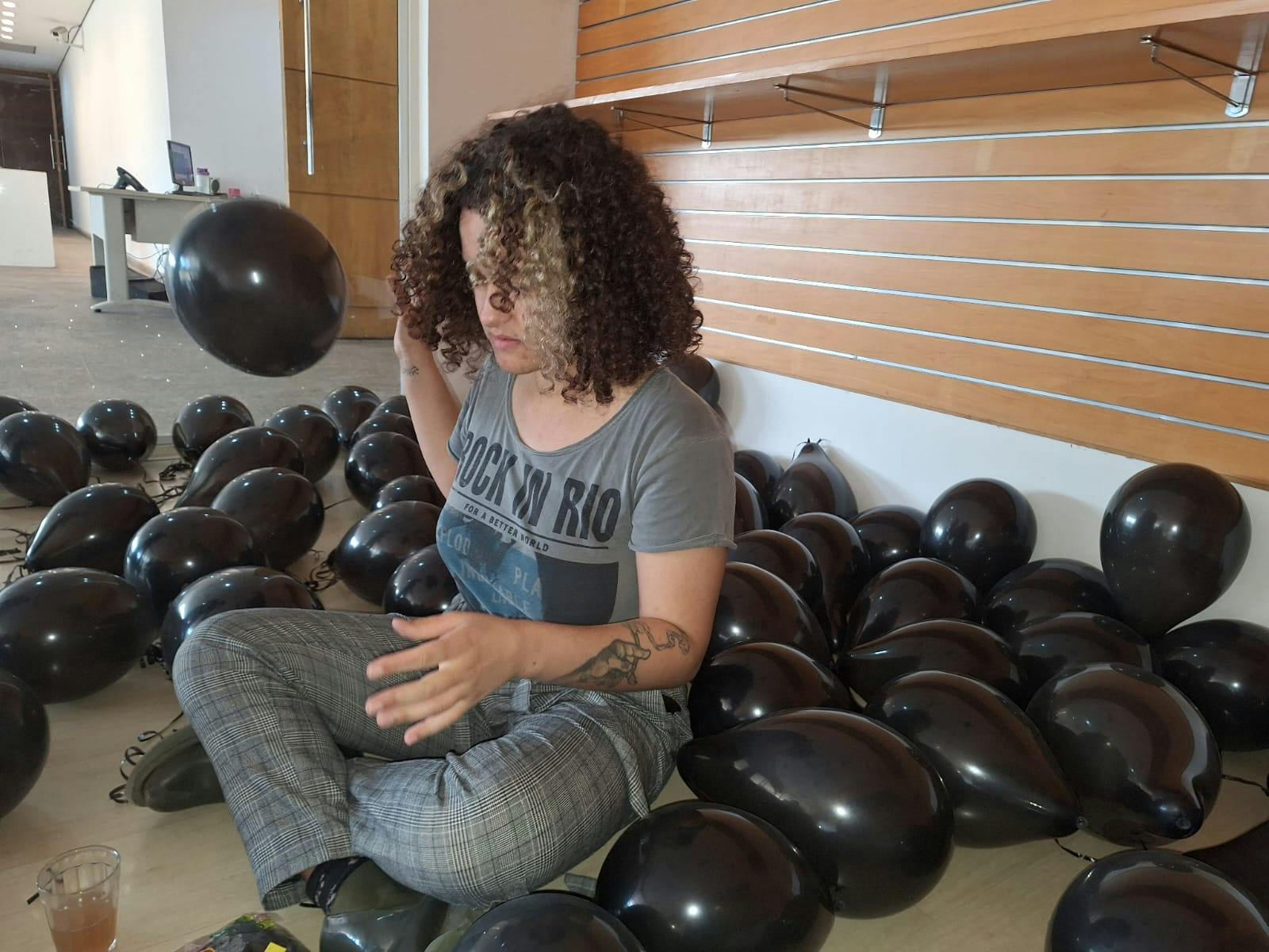 Clara Moreno cercada de balões pretos. Foto: Natalia Clima