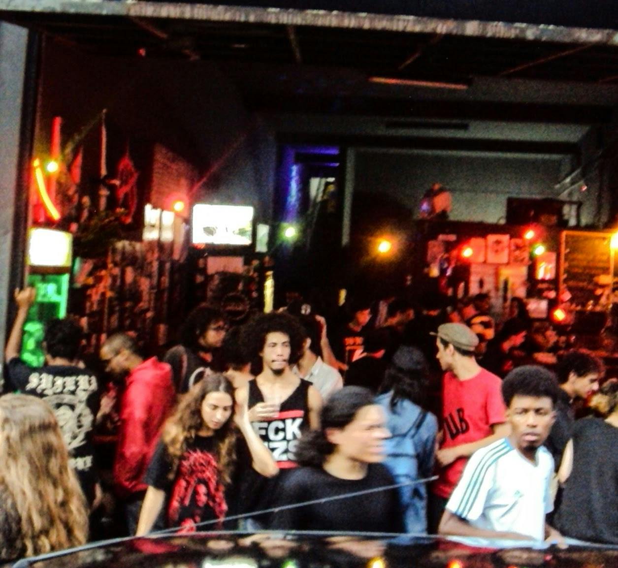Os trabalhos se iniciaram pontualmente por volta das cinco da tarde (risos). Apesar da temporada de chuvas que assola a megalópole, a expectativa era de casa lotada. Aos poucos, o local foi adquirindo forma e se diversificando com punks, headbangers, gyarus, goths, emos, pessoas de todas as cores, gêneros e gostos, todos reunidos com o propósito de celebrar o morto, numa espécie de dor pela perda, só que do avesso. Nesse momento de tensão, onde quem tem que calibrar no goró calibra e quem tem que deixar a sobriedade em segundo plano deixa. Nossa equipe já estava a postos para registrar toda a comoção.